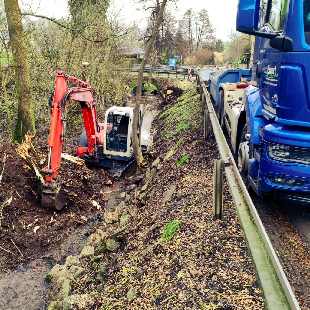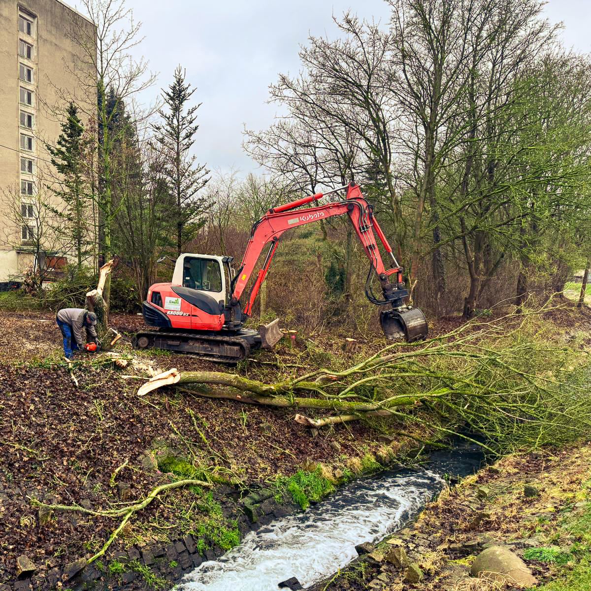 Im Bereich Wasserwege übernehmen wir Maßnahmen zur Sicherung, Pflege und Entwicklung von Gewässern sowie deren Uferbereichen. Dazu zählen insbesondere Bachbett-Sanierungen zur Stabilisierung der Gewässersohle, zur Verbesserung des Wasserabflusses und zur ökologischen Aufwertung. Ergänzend führen wir Arbeiten zur Flussufer-Pflege durch, wie Böschungssicherung, Entfernung von Ablagerungen und Aufwuchs sowie die Instandhaltung von Uferbefestigungen. Durch regelmäßige Pflege- und Sanierungsmaßnahmen gewährleisten wir die Funktionsfähigkeit der Gewässer, unterstützen den Hochwasserschutz und tragen zum Erhalt naturnaher Lebensräume bei.